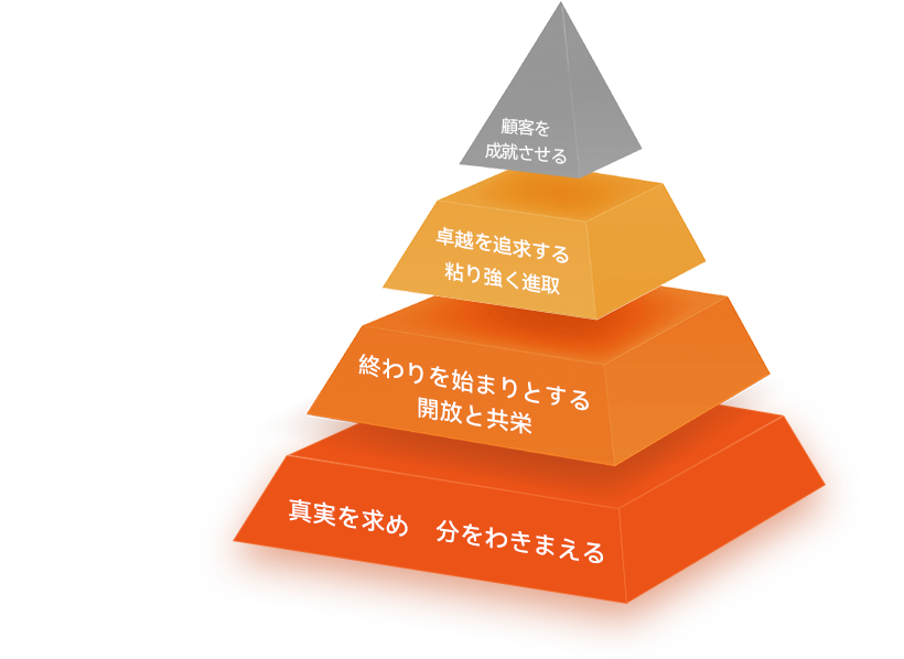 文化的価値観:顧客を成就させる|卓越を追求する|粘り強く進取|終わりを始まりとする|開放と共栄